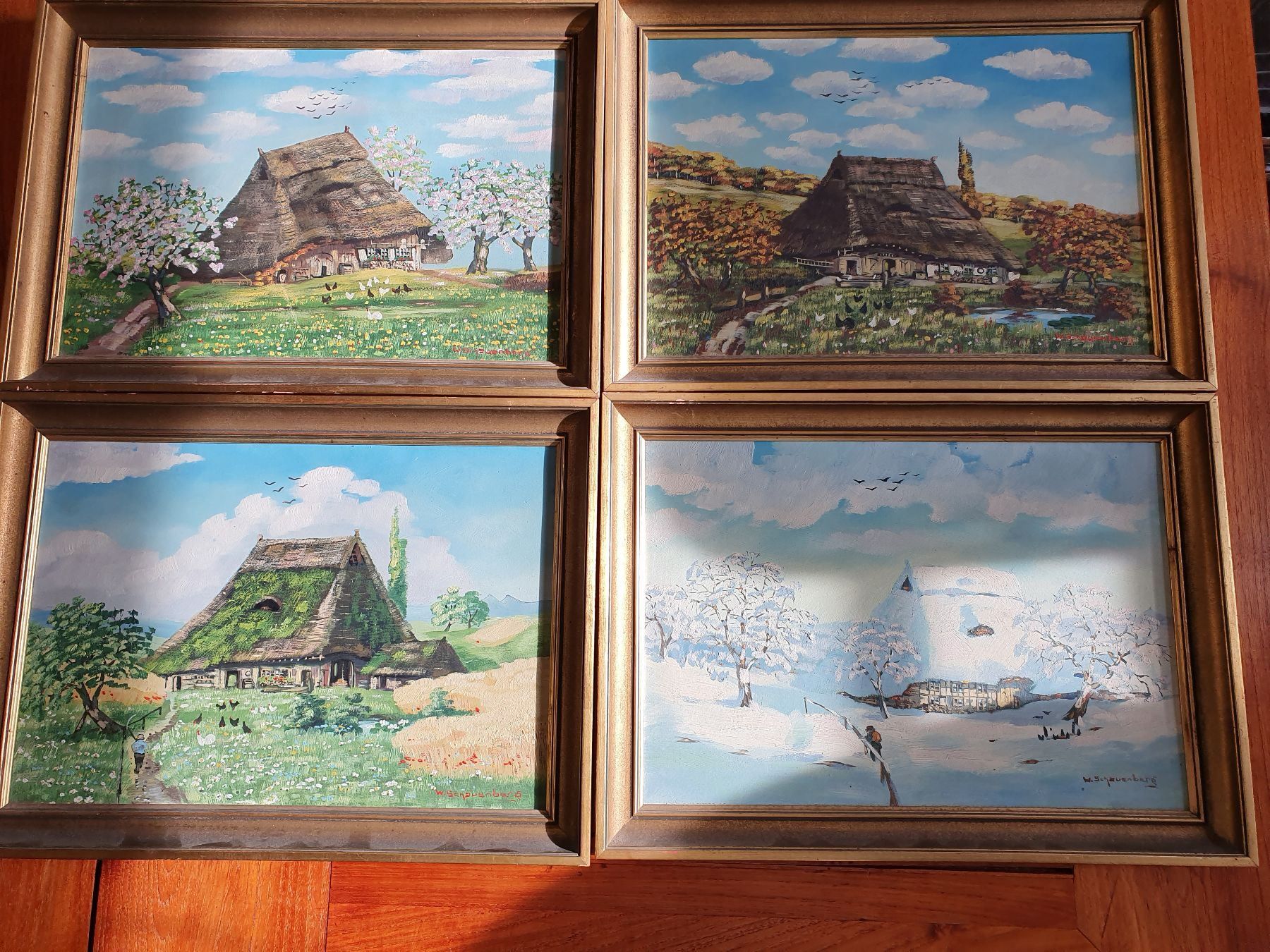 4 BILDER NAIVE Hinterglasmalerei original - Vier Jahreszeiten im Holzrahmen - - EUR 29,00 | PicClick DE
